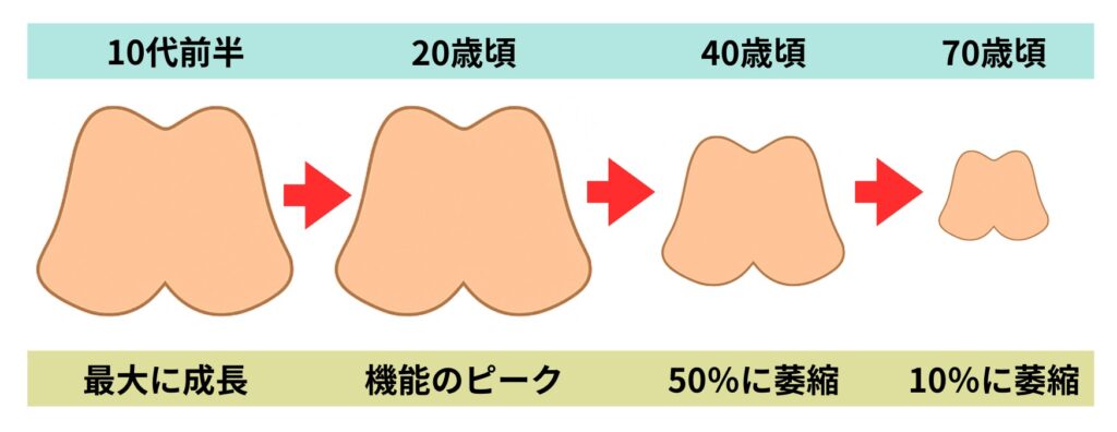胸腺は10代前半で最も大きく、20歳でピークを迎え、40歳で半分、70歳では10%以下に縮小するといわれています。胸腺が萎縮すると免疫力も低下するので長持ちさせることで免疫力を維持できるのです。